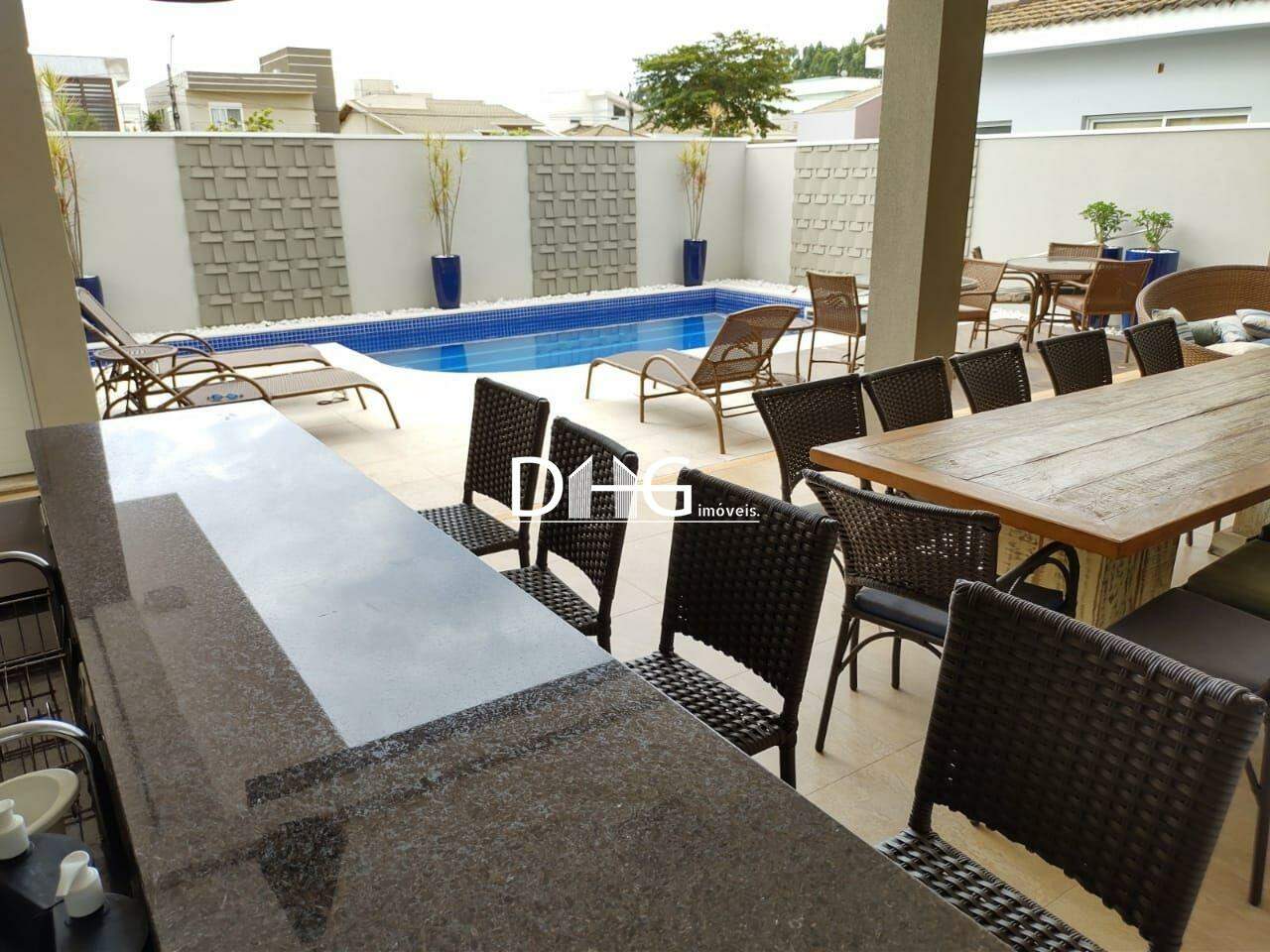 Área gourmet e piscina com espaços amplos e harmônicos ao design da casa.