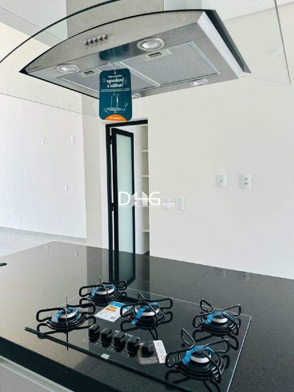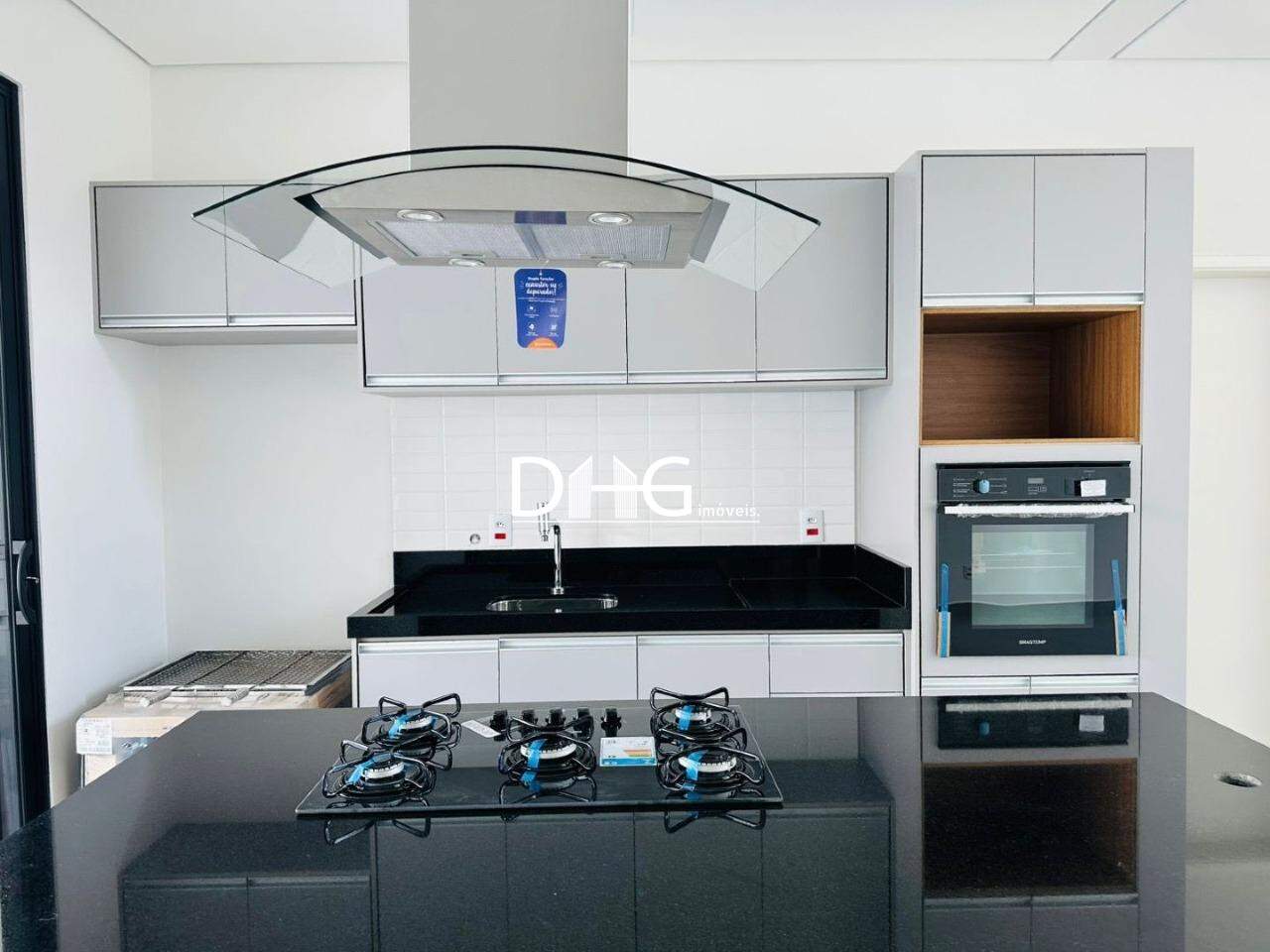 Cozinha planejada com forno e ilha com cooktop e exaustor.