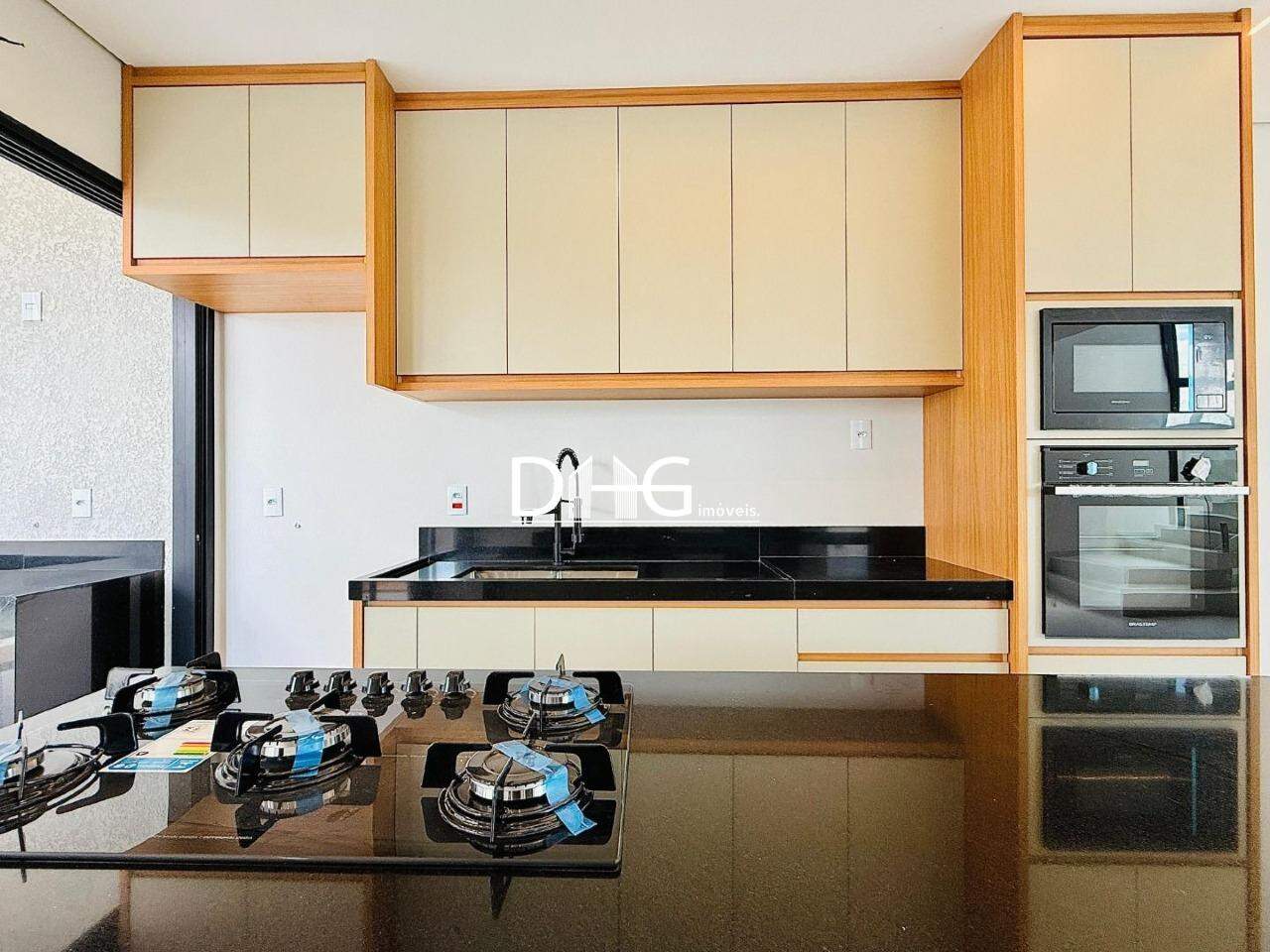 Cozinha planejada e já com microondas, forno e cooktop.