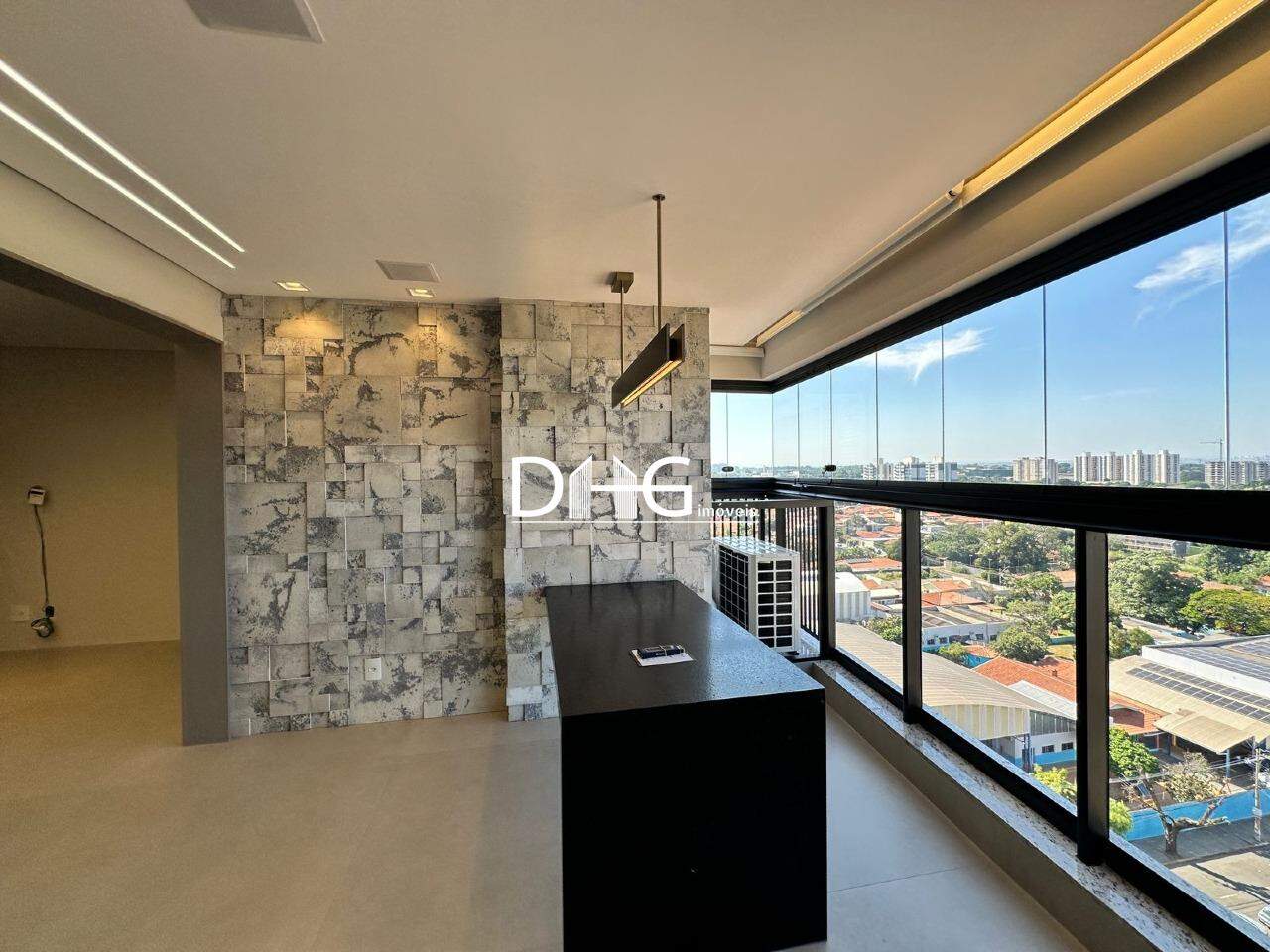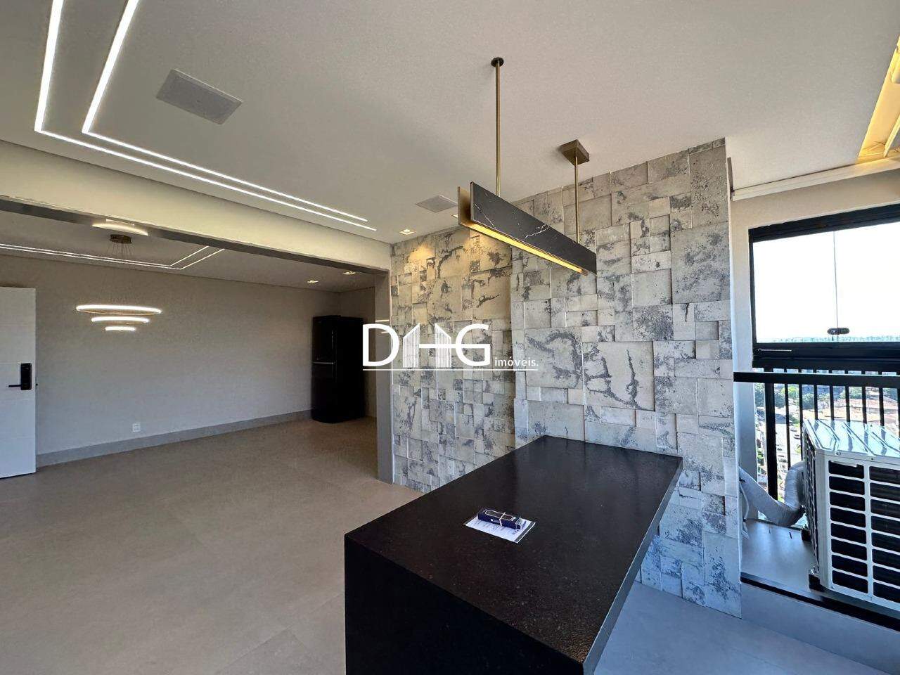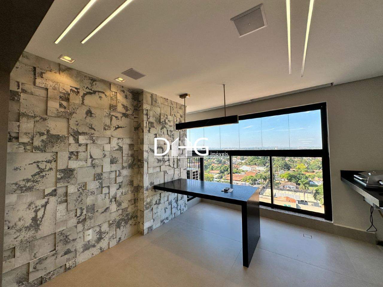 - Sala planejada com painel e iluminação em led, parede em pedra 3D, ar condicionado.